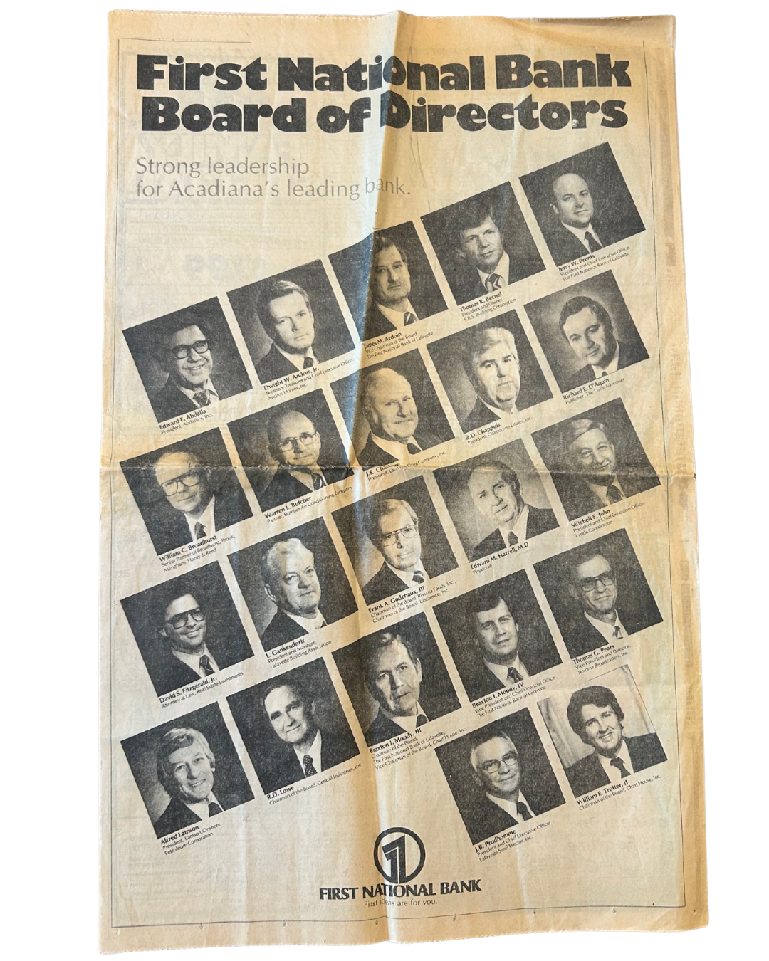 Before earning recognition as a visionary developer, Thomas E. Becnel began his professional journey in the financial sector, where he served on the Board of Directors of First National Bank. An archival newspaper piece featuring the full board highlights the institution’s strength and leadership during one of its most active periods, and Becnel’s inclusion on this board reflects the trust, respect, and confidence placed in him by the region’s business community. Surrounded by prominent civic and business leaders, he contributed to the oversight and strategic direction of one of Acadiana’s leading financial institutions.