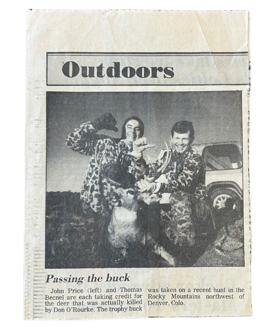 Beyond his business achievements, Thomas Becnel held a genuine appreciation for the outdoors and the traditions that come with it. Hunting was one of the hobbies he enjoyed throughout his life, offering him time to connect with nature and to share memorable experiences with friends. An archival “Outdoors” newspaper feature captures this spirit perfectly, showing Becnel on a Rocky Mountain hunting trip northwest of Denver. The photo highlights the camaraderie and lighthearted fun that defined many of his outdoor adventures, reflecting the joy he found in spending time in wide-open spaces and celebrating the traditions of the hunt.